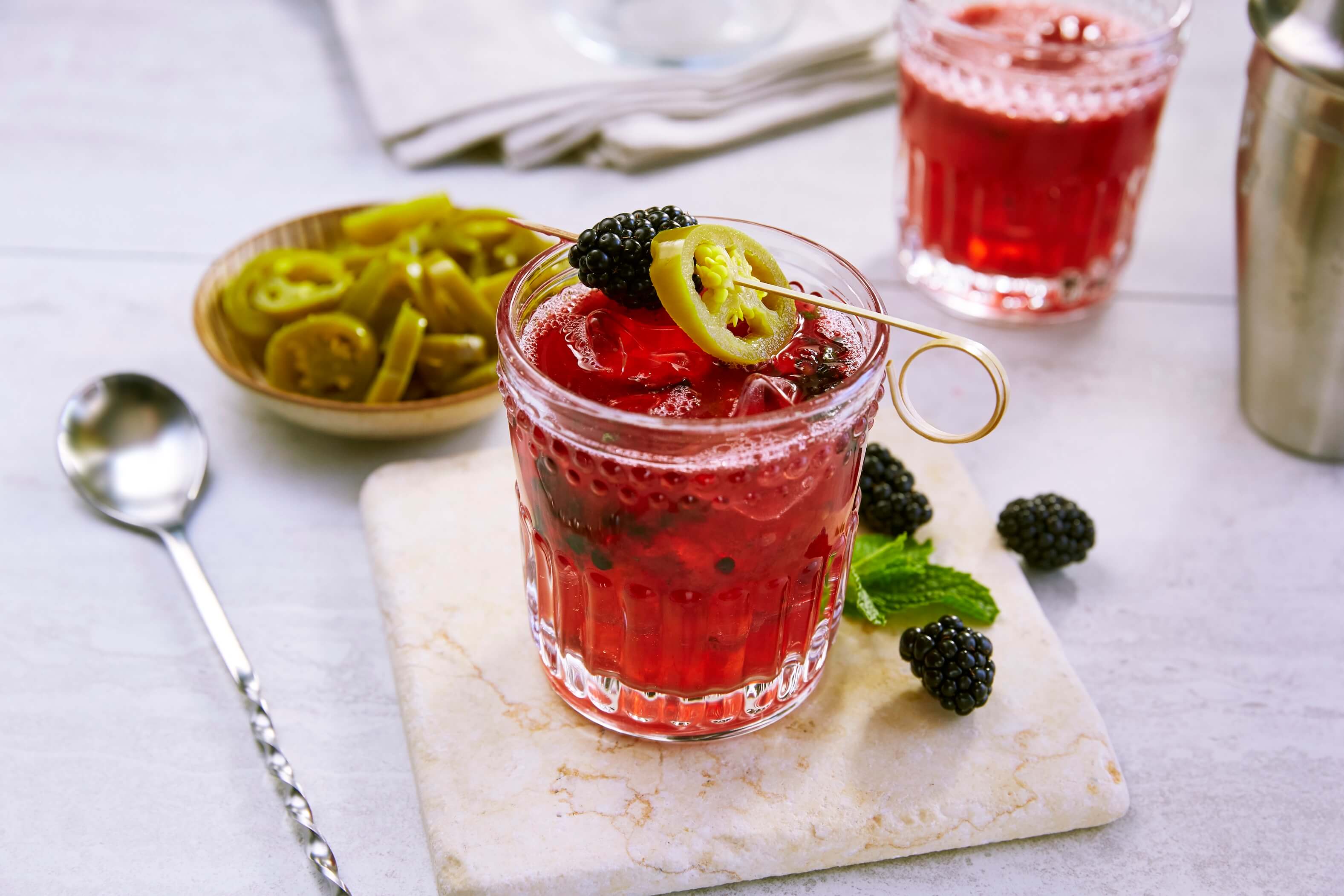 Blackberries and fragrant mint are muddled with our Mezzetta® Sliced Tamed Jalapeños to create the perfect summer cocktail with just the right amount of sweetness and heat. Try it tonight for a smash sensation.