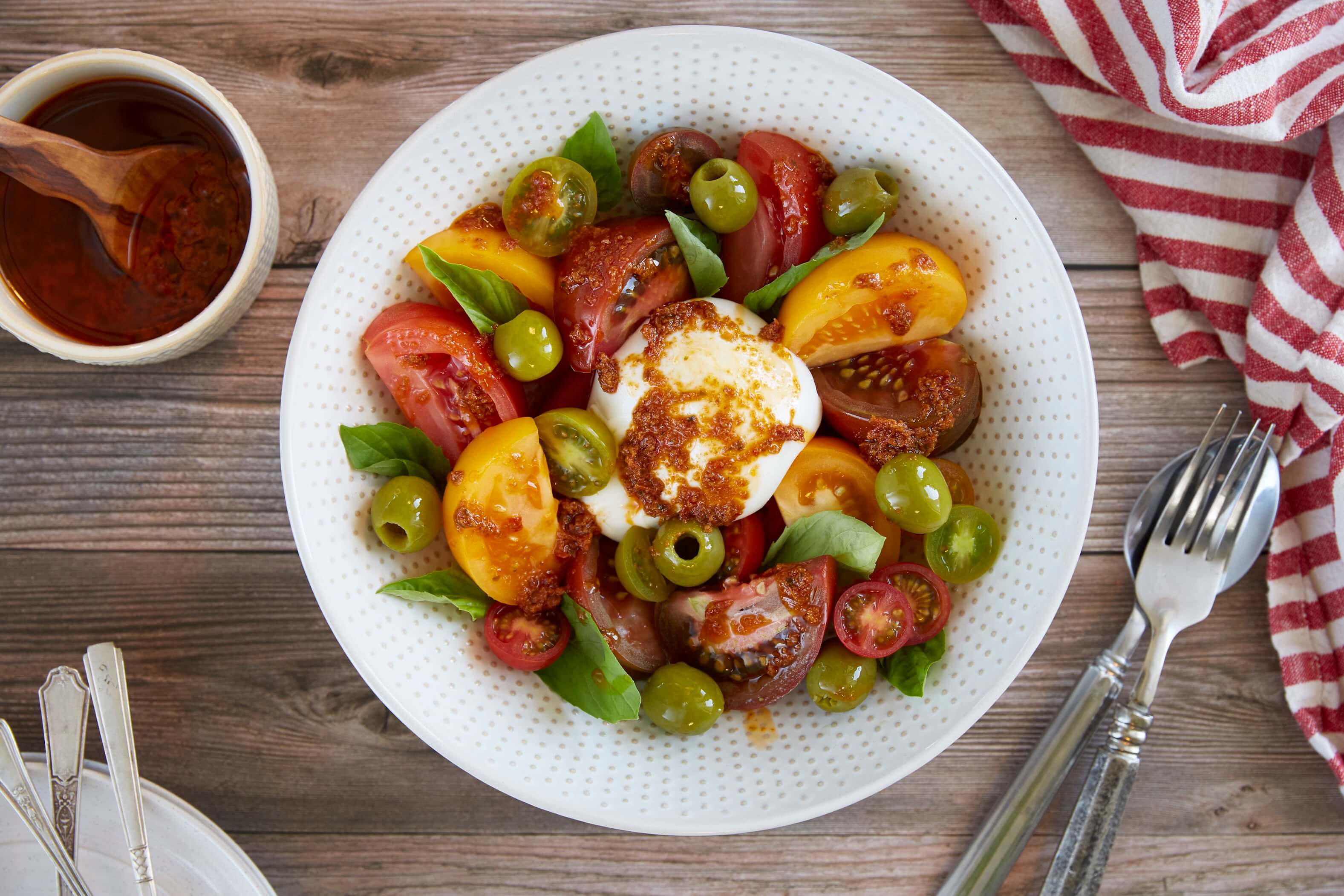 Healthy, simple and fresh! This perfect summer tomato salad with creamy burrata gets the buttery, briny treatment thanks to our Pitted Italian Castelvetrano Olives. Tossed together with fresh basil leaves, and drizzled with a tangy dressing of oil, vinegar and our Artisan Ingredients® Tomato Pesto, this simple summer side dish is sure to impress.