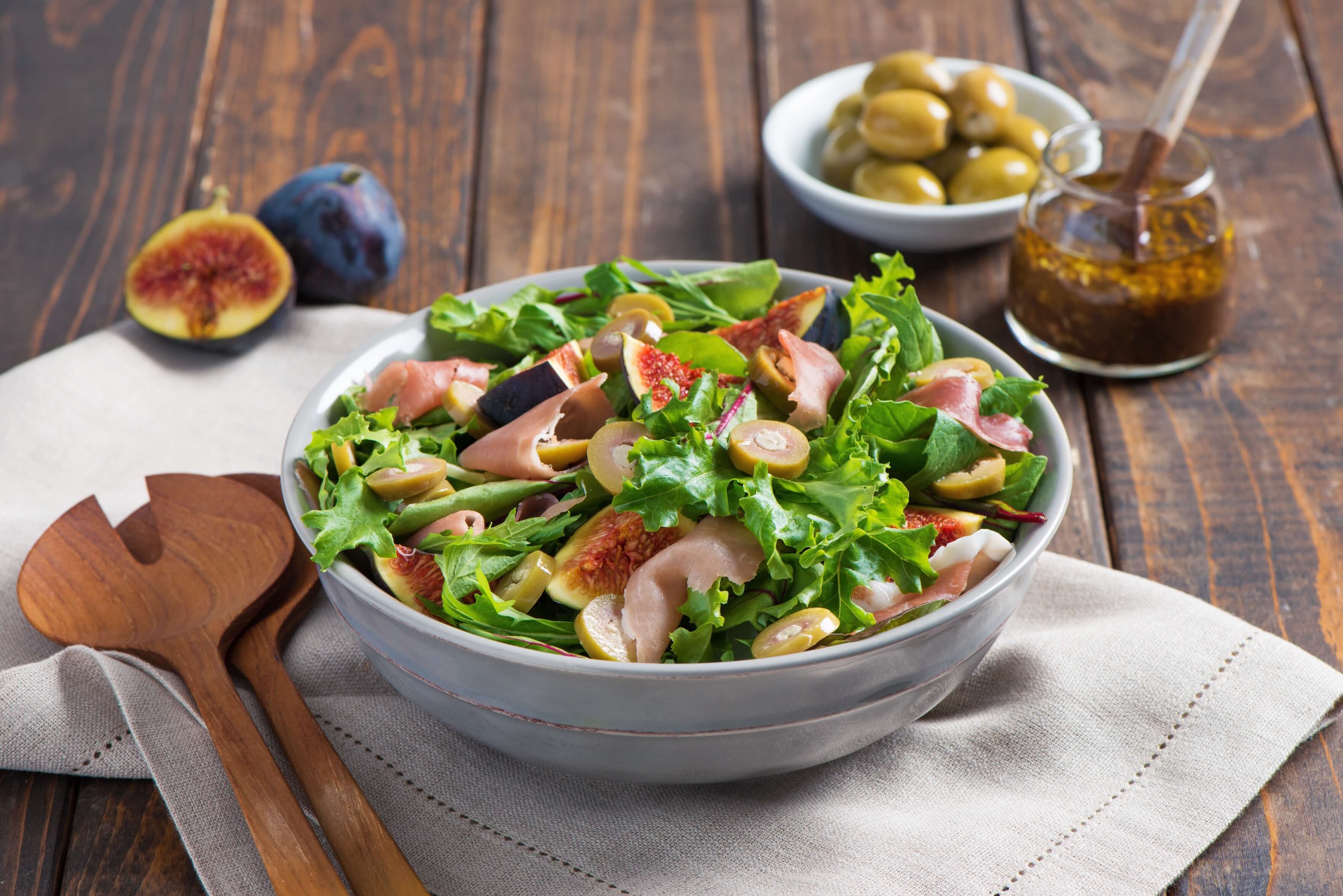 - To a large salad bowl, add the spinach, figs, apple, sliced Mezzetta® Bleu Cheese Stuffed Olives, torn prosciutto and candied pecans. Drizzle the salad with desired amount of dressing before serving.