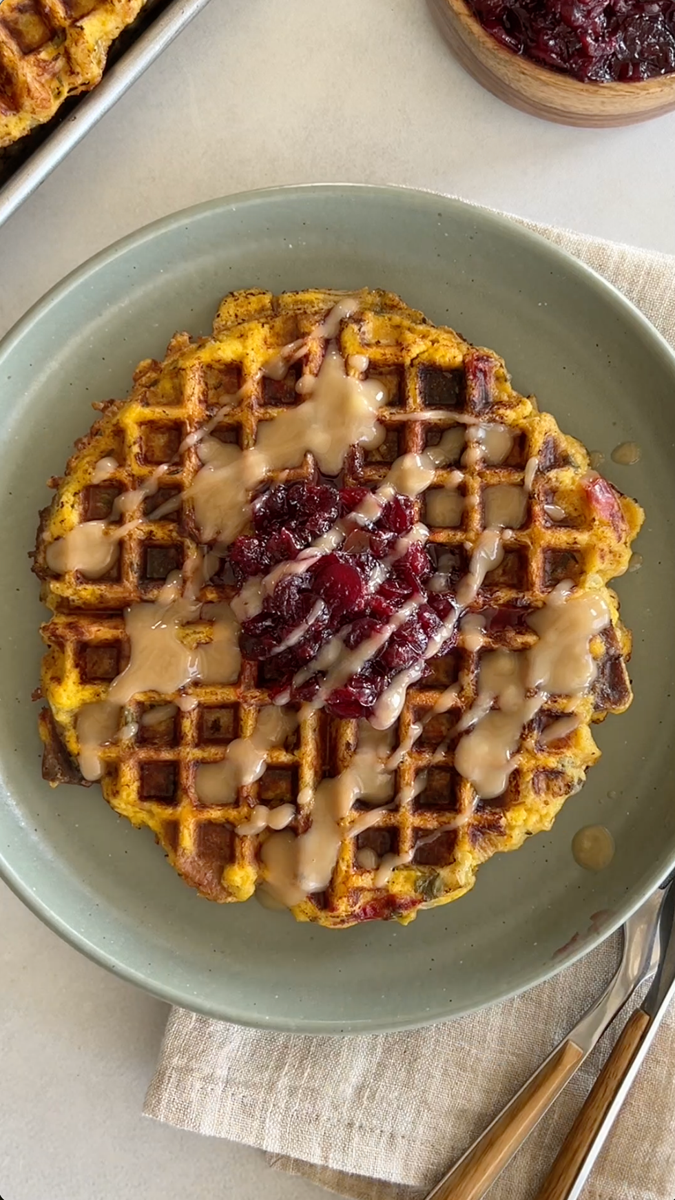 - Spray a preheated waffle maker with nonstick cooking spray and add a few spoonful’s of the stuffing mixture and spread to cover.