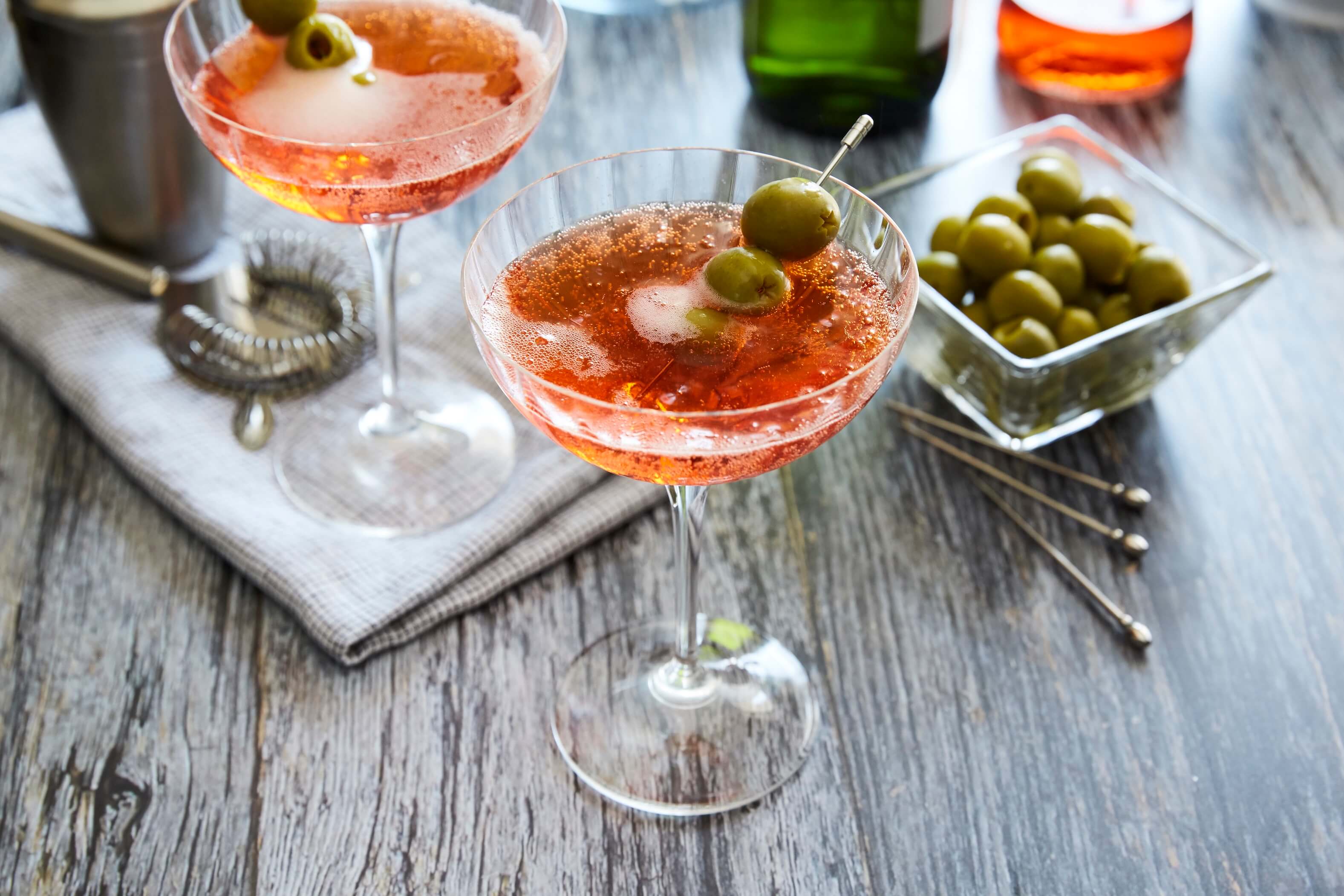 - Divide the mixture between 2 champagne flutes and add the sparkling white wine to fill. Garnish with a skewer of Mezzetta® Pitted Italian Castelvetrano Olives and serve.
