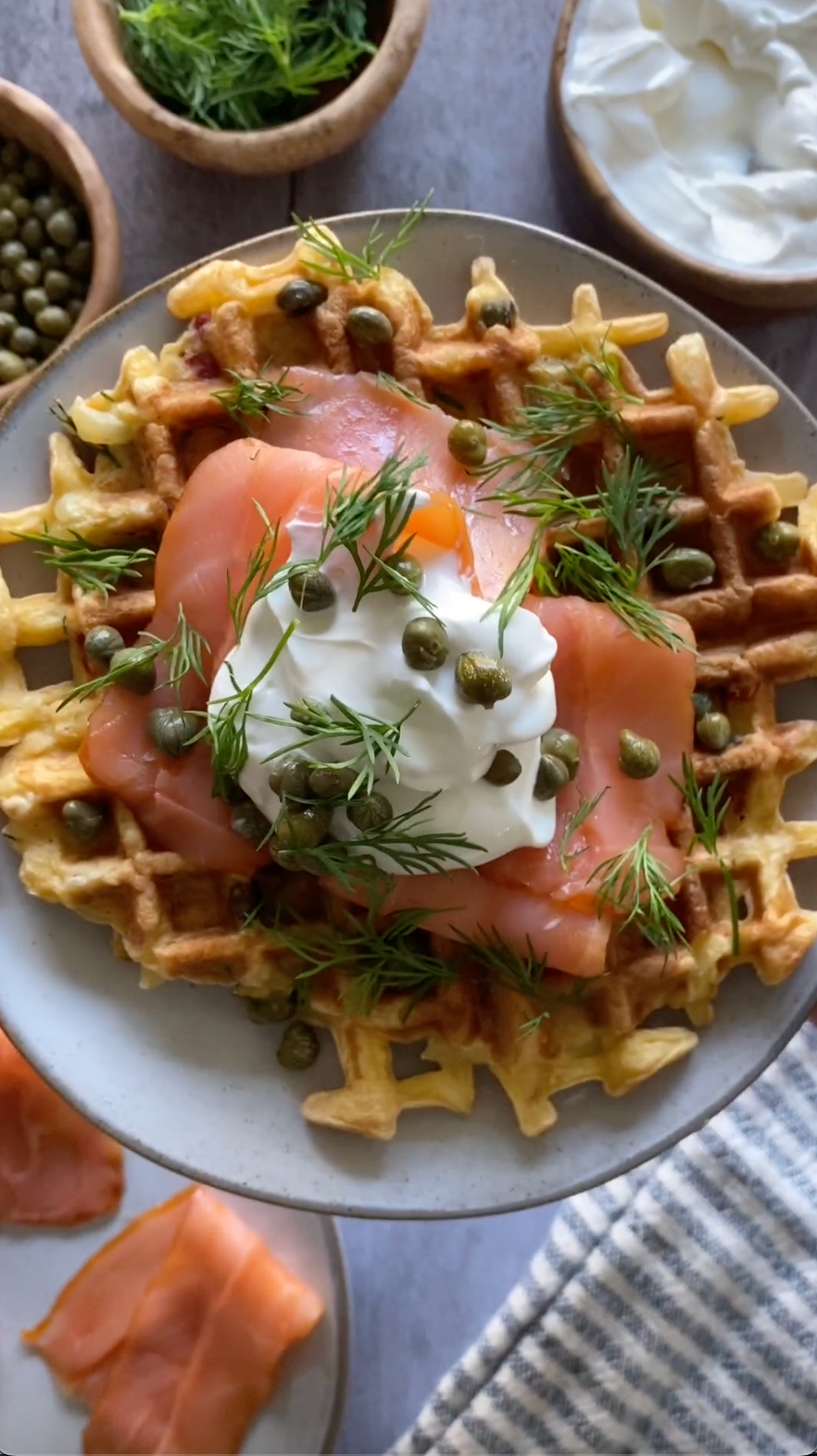 Serve these warm, waffle-pressed latkes with silky smoked salmon, cool sour cream, and an extra sprinkle of capers and dill for a beautiful, elevated presentation. Perfect for Hanukkah brunch, holiday entertaining, or any time you crave comforting potato goodness with a gourmet edge, these latke waffles are as fun to make as they are to eat.